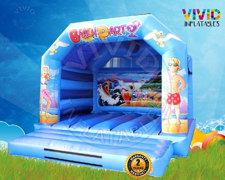 Beach party Adult Castle All Disco domes feature external and internal PVC reinforcing on all high load areas. This Bouncy Castle is fully BS EN compliant British Standard Dimensions Length: 5m96 (16.0') Width: 4m57 (15.0') Height: 3m96 (13.0') Comes with : FREE 2 year Manufacturers Warranty on seams back to base Webbed bed and step Sewn in rain cover Filler pipe and Zip 1.5hp blower (This is not Included in price but sold separately). Heavy duty Stakes Quadruple stitched Material: PVC 610gsm Flame retardant Test Certificate for 12 months to BSEN British Standard Log book Operating instructions Excellent after sales care and as much advice you will need to run a successful inflatable business. Delivery is at an extra cost