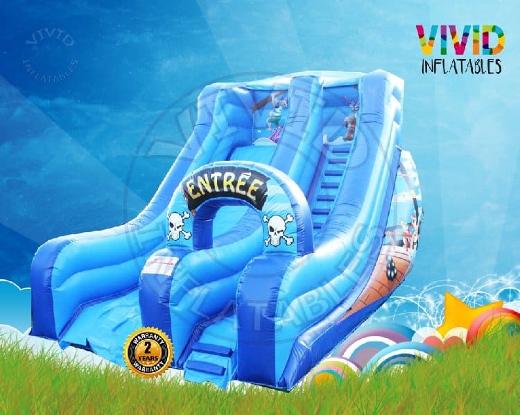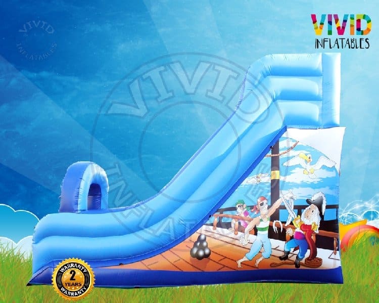 This slide is perfect for any occasion. Ideal for large sized garden. This slide has fantastic artwork printed and sealed. All slides feature external and internal PVC reinforcing on all high load areas. Heavy duty foam ladder climb with Velcro to hold it in place - protects the bed. Heavy duty slip sheet again with Velcro to protect the bed. This Slide is fully BS EN 14960 compliant and can be PIPA tagged for an additional fee Dimensions Length: 6m10 (20.0') Width: 4m20 (14.0') Height: 4m20 (14.0') Platform Height : 3m00 (10.0')
